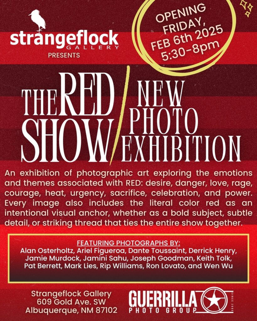 Join us for the opening of “The Red Show!” An exhibition of photographic art exploring the emotions and themes associated with RED: desire, danger, love, rage, courage, heat, urgency, sacrifice, celebration, and power. Every image also includes the literal color red as an intentional visual anchor, whether as a bold subject, subtle detail, or striking thread that ties the entire show together.