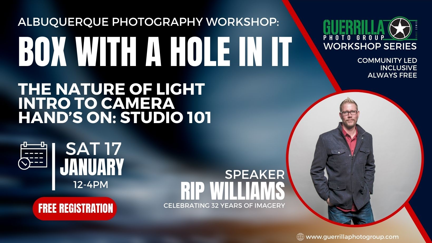 FeaturedGuerrilla Photo Group 609 Gold Ave. SW, STE 2A, Albuquerque, NM, United StatesSchedule: 12:00 PM: Welcome and Introductions LECTURE 1 (12:15-12:45pm): “THE MEANING OF LIGHT” or the “photo” in PHOTOgraphy Learn about the four “facets” of light: direction, quantity, color, and quality. LECTURE 2 (12:45-1:15pm): “BOX WITH A HOLE” or intro to camera the “graphy” in photoGRAPHY Understand the exposure triangle, “stops”, shutter speed, aperture, ISO/ASA speed, reciprocity, white […]